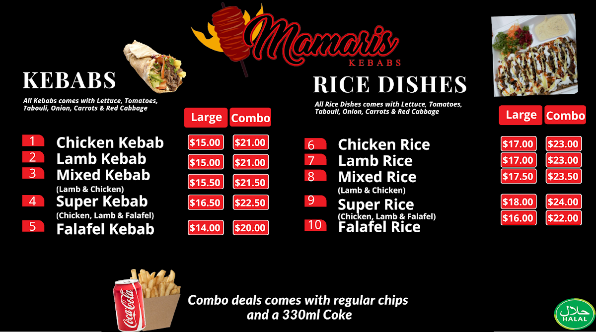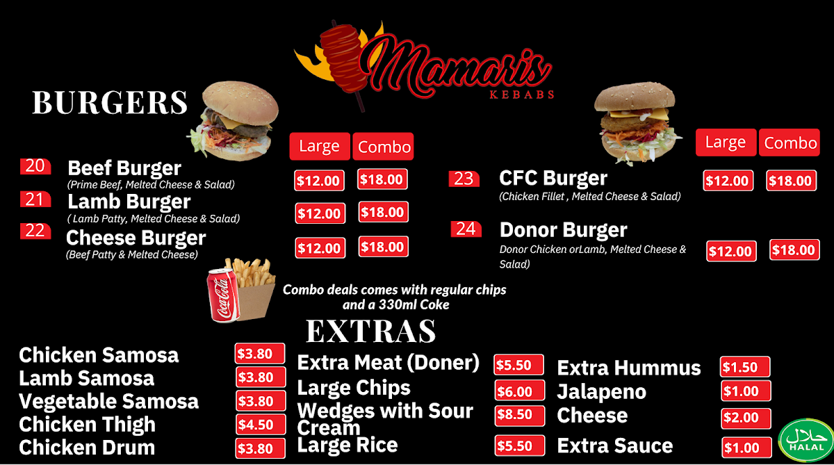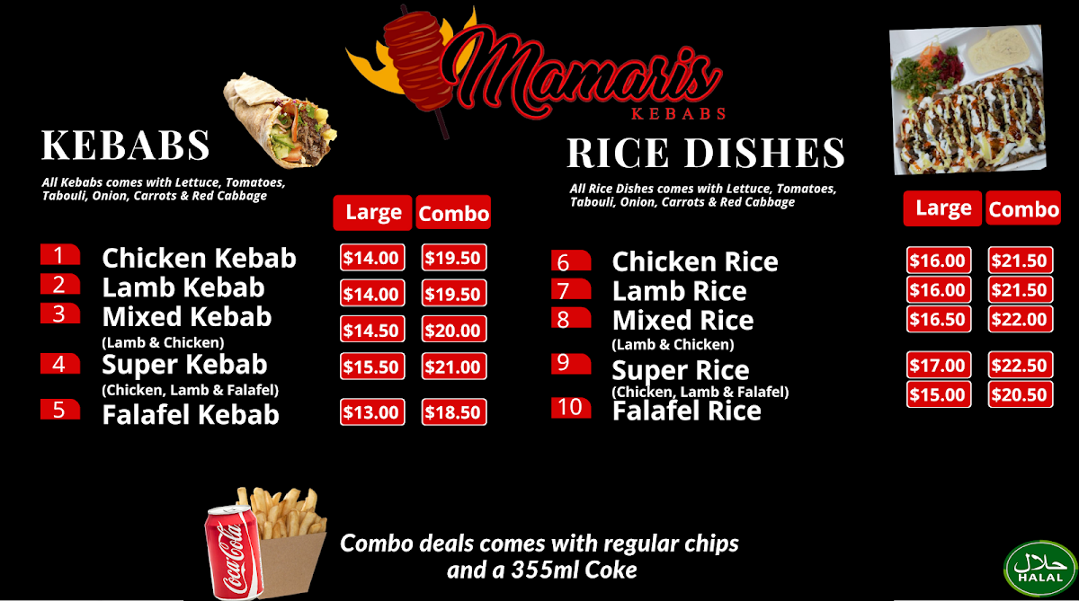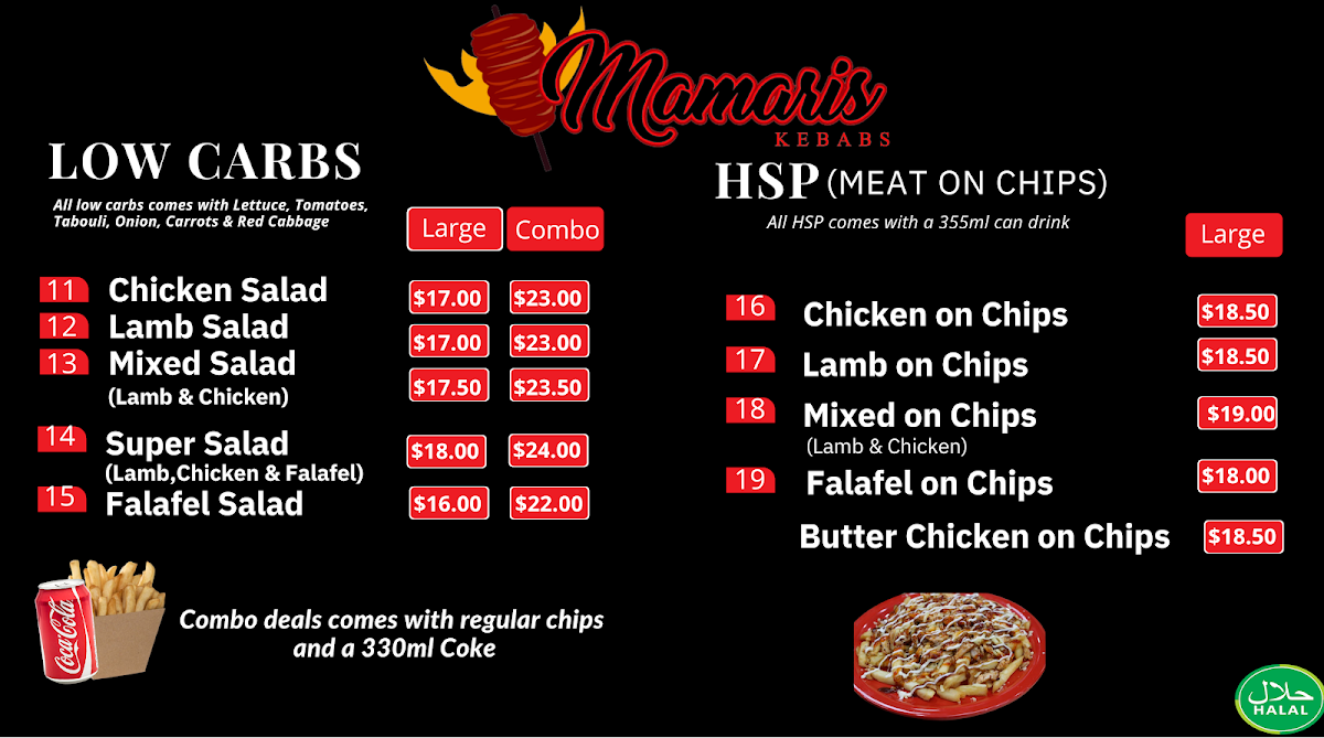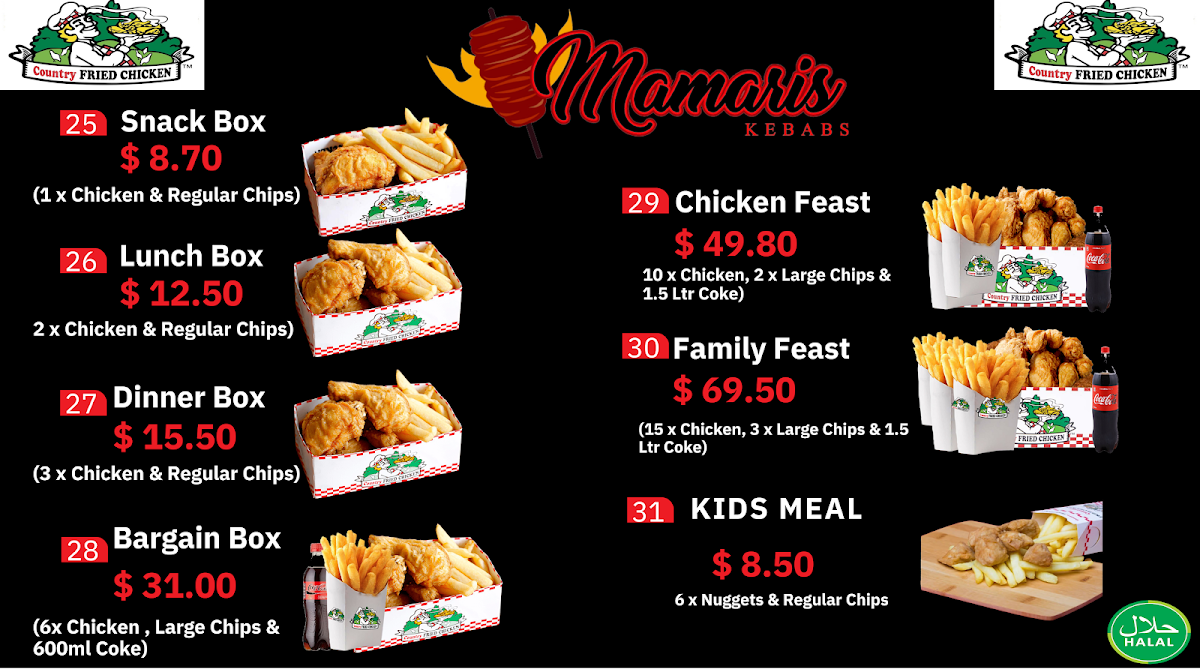 From a reviewer’s perspective, the menu at Mamaris Kebabs offers a concise yet satisfying selection that focuses on hearty, comfort-style dishes at accessible prices. The range spans from flavorful Kebab and Rice dishes to indulgent Low Carbs & Meat on Chips, catering to both traditional and low-carb preferences. Their burger lineup, alongside Burgers and ExtrasCountry Fried Chicken, adds a familiar fast-food touch, making it easy for diners to mix and match. The inclusion of curry options like Butter Chicken brings a warm, rich alternative for those seeking something saucier and more aromatic. While the menu is not overly extensive, its strength lies in offering well-loved staples done right, making it a reliable spot for a quick, filling meal.